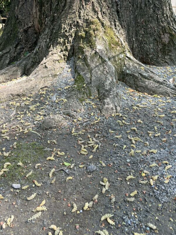 4月のやわらかな風に乗って、境内のイチョウの雄花はそっと外の世界へと旅立ちます。